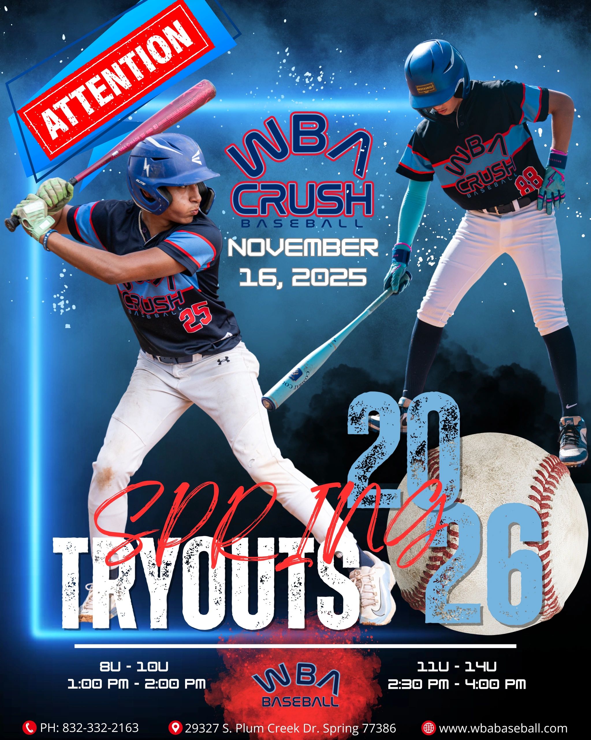 Dream BIG work harder! New season - New goals. New opportunity to prove you belong. Spring 2026 Tryouts are here, let's see what you've got. Come baseball ready and be prepared to complete a quick questionnaire upon arrival.